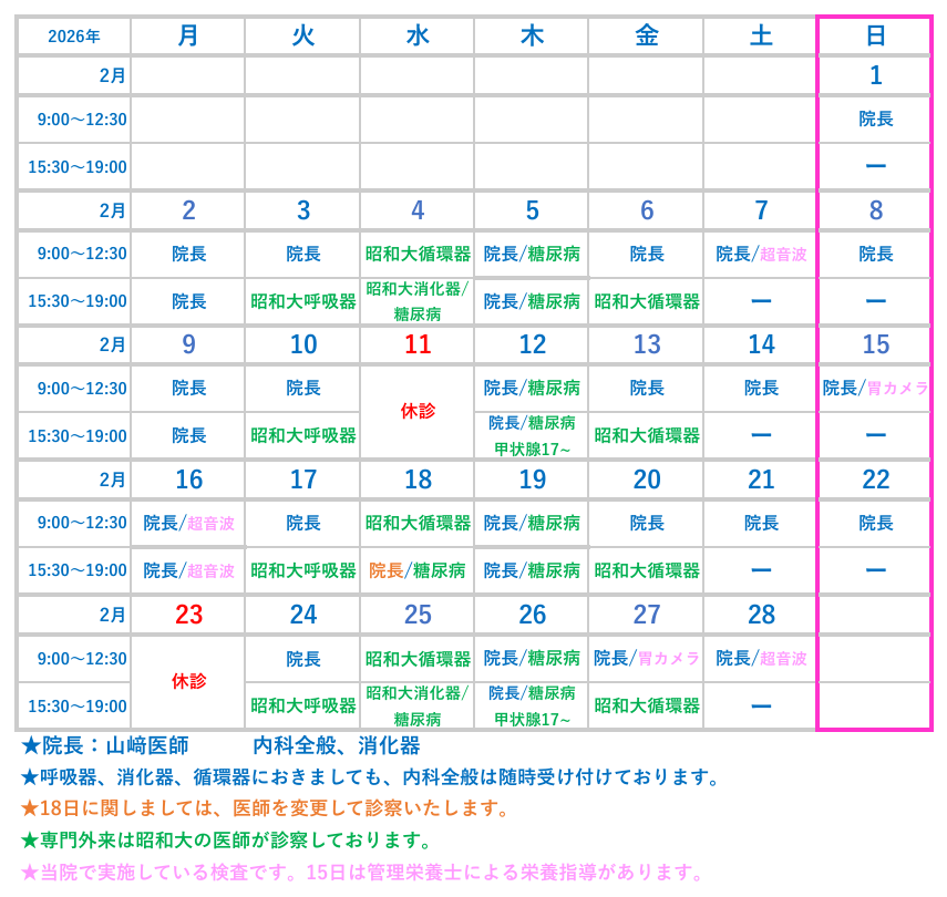 当院の2026年1月,2月のカレンダーです。急な変更・休診の場合もございますので、お知らせやX(旧Twitter)をご確認いただくか、ご心配な場合はお気軽にお問合せ下さい。TEL:045-910-1108