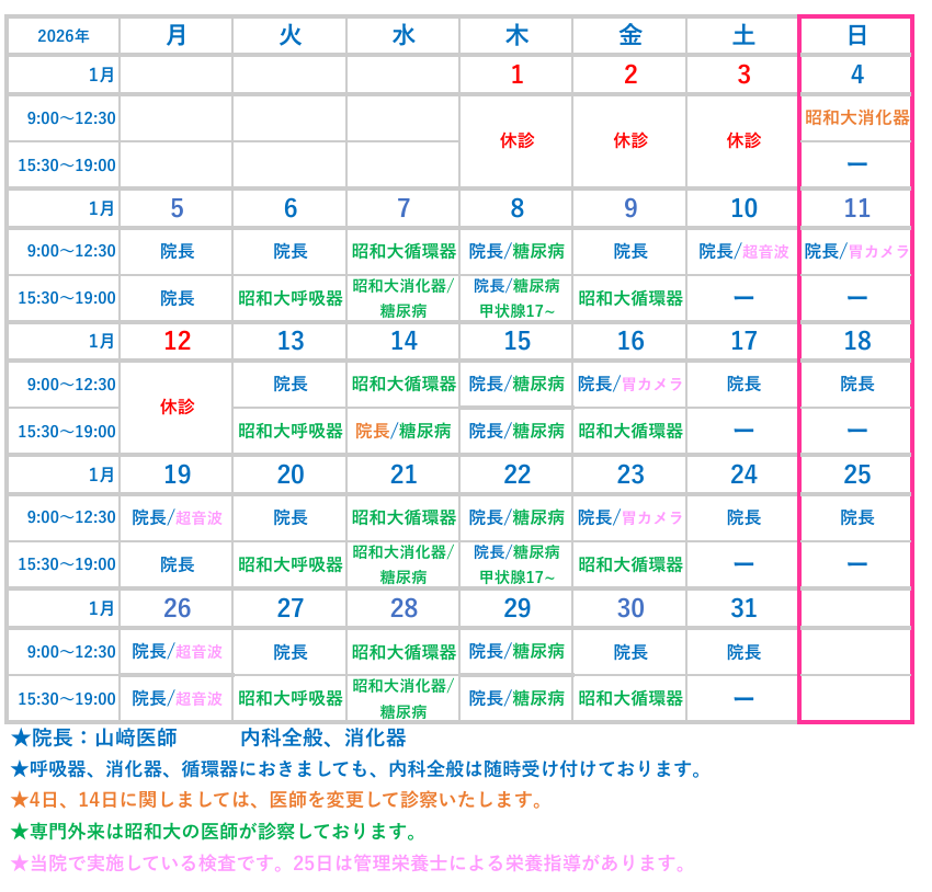 当院の2026年1月,2月のカレンダーです。急な変更・休診の場合もございますので、お知らせやX(旧Twitter)をご確認いただくか、ご心配な場合はお気軽にお問合せ下さい。TEL:045-910-1108